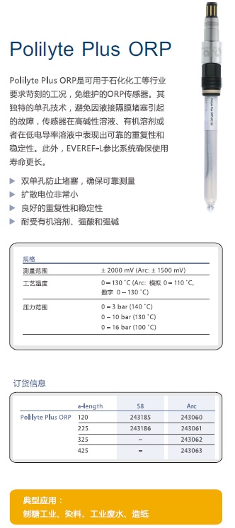 Polilyte Plus ORP是可用于石化化工等行業(yè)要求苛刻的工況,,免維護(hù)的ORP傳感器。其獨(dú)特的單孔技術(shù),,避免因液接隔膜堵塞引起的故障,,傳感器在高堿性溶液、有機(jī)溶劑或者在低電導(dǎo)率溶液中表現(xiàn)出可靠的重復(fù)性和穩(wěn)定性。此外,,EVEREF-L參比系統(tǒng)確保使用壽命更長(zhǎng)。