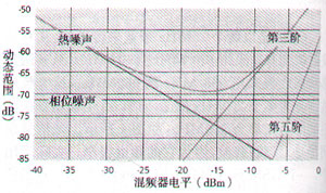 相鄰信道功率比(ACPR)或低電平IMD的測量要更困難,更需要注意頻譜分析儀的能力。圖2顯示了頻譜分析儀的熱噪聲、相位噪聲和第三、第五階交調(diào)失真與混頻器電平的關(guān)系。由于精確測量ACPR所需的動態(tài)范圍接近或超出了很多頻譜分析儀的性能極限,所以必須全面考慮之后才有把握進行正確測量。
