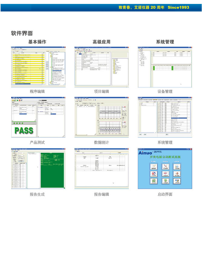 主要特點 1.兼容多種類型:系統(tǒng)采用艾諾自主研發(fā),擁有自主知識產(chǎn)權的高性能儀器組成,滿足客戶多樣性產(chǎn)品測試要求,一種型號可兼容多種類型產(chǎn)品:適配器/充電器/電源板,,PDP/LCD Inverter/LIPS/LED。 2.并行多路測試:系統(tǒng)采用多路并行架構設計,可同時測試4路/8路以及更多的充電器/適配器,也可并行測試2路/4路多通道輸出的開關電源板、背光電源板、PC電源。 3.獨有高速模式:在優(yōu)化測量測試性能和速度的基礎上,系統(tǒng)的通信命令可并行發(fā)送,多機同步并行處理,測試速度更快。 4.數(shù)據(jù)一致穩(wěn)定:系統(tǒng)采用艾諾高精度儀器,,并通過嚴格的一致性、穩(wěn)定性測試,保障本機測試數(shù)據(jù)的穩(wěn)定性以及多機之間的一致性。 5.易學習易使用:系統(tǒng)所使用的工裝在考慮信號穩(wěn)定性的同時兼顧人性化操作;測試軟件在擁有強大的項目編輯、報表編輯、命令編輯的同時兼顧國人學習操作習慣,中英文顯示;
